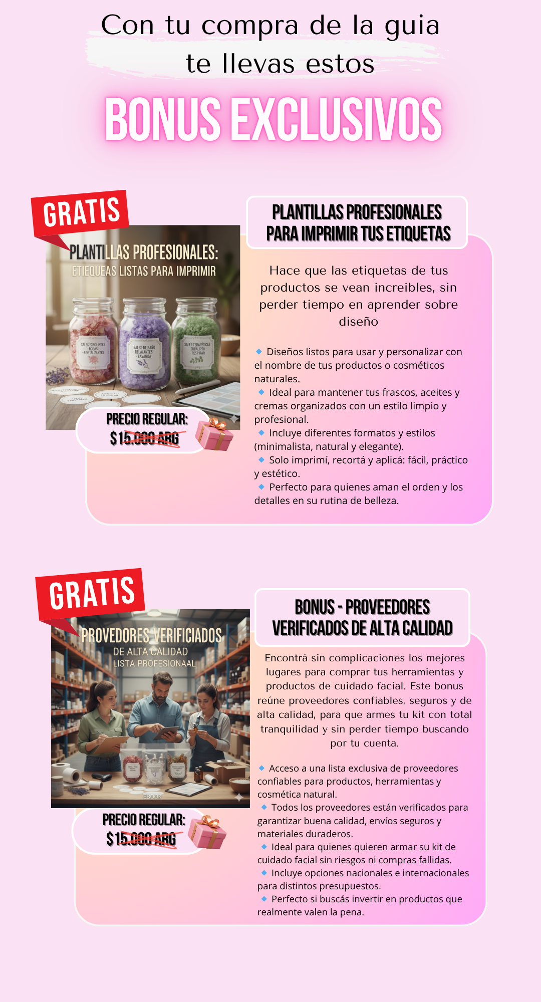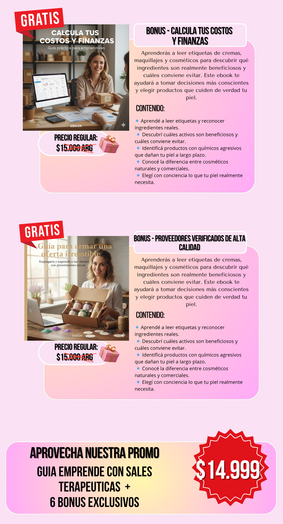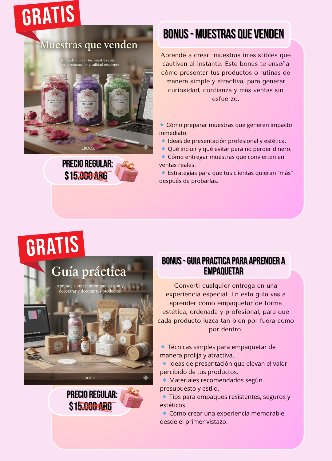 El ebook incluye un bonus especial de empaquetado profesional y plantillas listas para usar. Aprendés cómo presentar tus sales de manera estética, limpia y lista para vender.